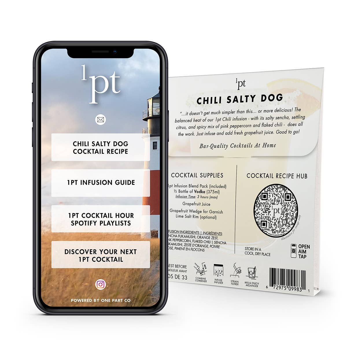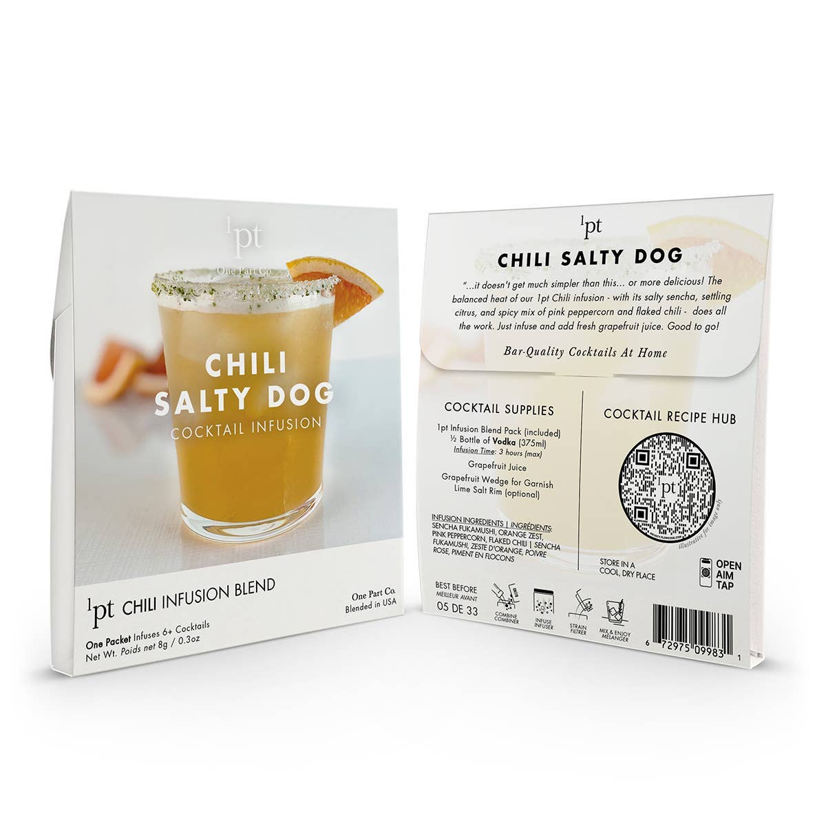 hili salty dog vodka cocktail: Let the balanced (manageable) heat of the chili infusion, with its salty sencha, settling citrus, and spicy mix of pink peppercorn and chili flakes, do all the work. Just infuse and mix in some fresh grapefruit juice and you're good to go!