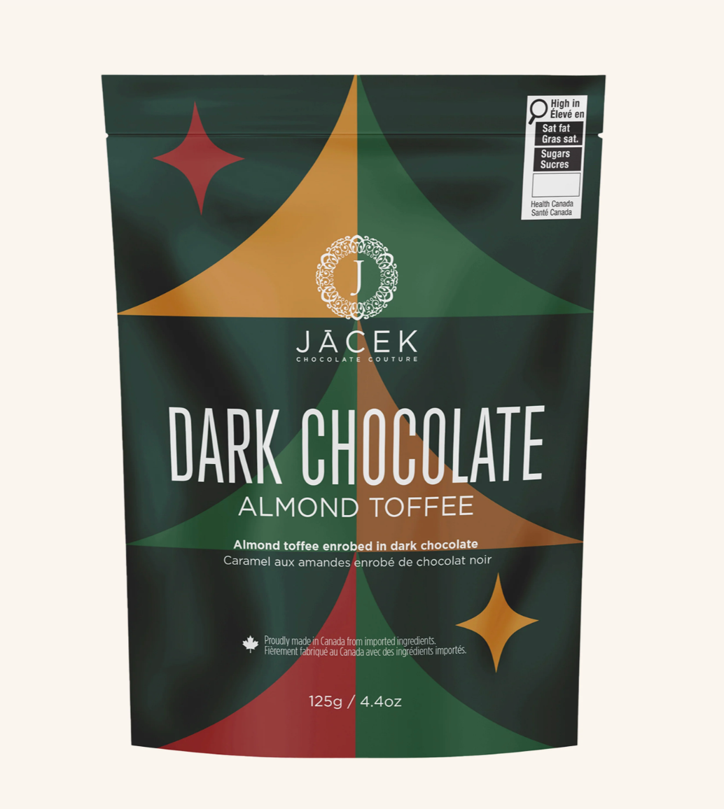 Our best-selling almond toffee, hand-crafted to perfection and enrobed in 62% dark chocolate. Buttery, crunchy, and utterly addictive — a true JACEK classic that keeps fans coming back year after year.