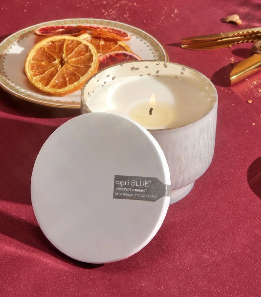 Presenting our Chestnut Embers Holiday Mercury Inverted Candle. This beauty features a mercury pearl etched finish and will fill your space with notes of roasted chestnut, bitter orange, black cardamom, tonka bean and ember musk. Whether you're hosting a party with friends or cozying up to a movie, this candle will fit the scene perfectly.