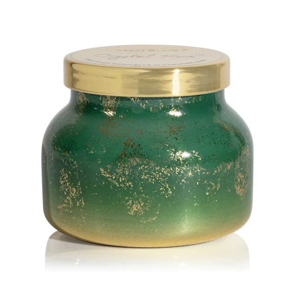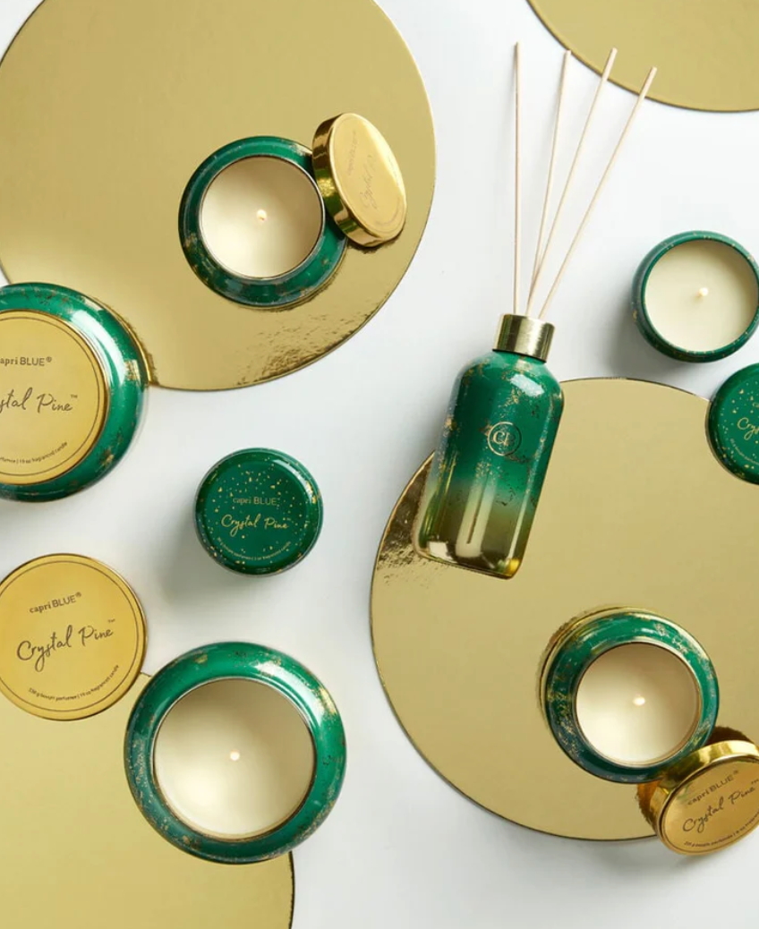 The Crystal Pine Petite Candle is showstopper wrapped in beautiful emerald green with touches of gold. It's filled with winter notes of frosted fir, snowy woods, pine and sage that will brighten up any room!