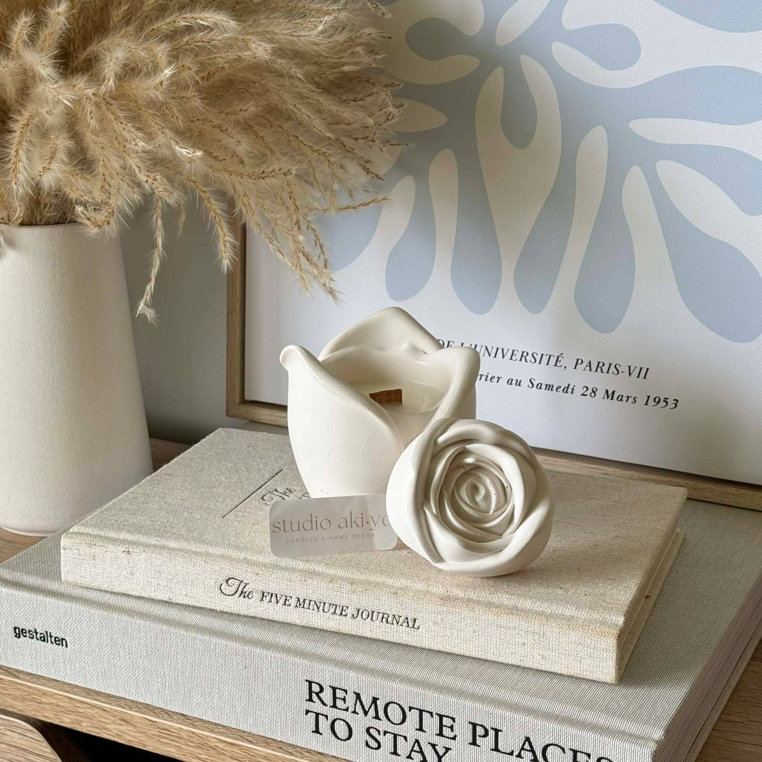 This scented candle is handmade into a unique rosebud vessel + lid & topped with a soothing crackling wooden wick.